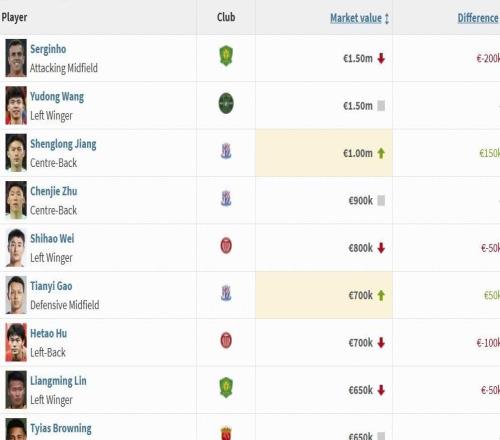 北京時(shí)間12月17日,德轉(zhuǎn)發(fā)布新一期中超球員身價(jià)。塞爾吉尼奧、王鈺棟以150萬(wàn)歐位居國(guó)內(nèi)球員身價(jià)榜首,3-5位分別為蔣圣龍、朱辰杰、韋世豪。新一期中超國(guó)內(nèi)球員身價(jià)榜前十(單位:歐